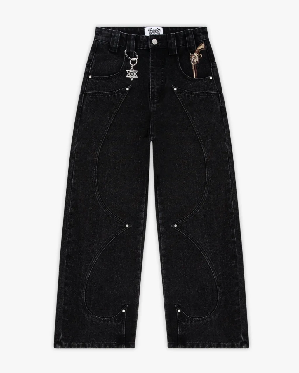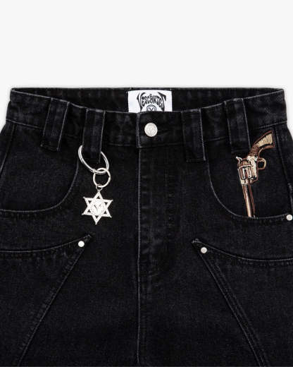 A fan favourite, brought back in black. The Fast Draw Denim brings to life a classic cowboy duel in over 200,000 stitches. Finished with custom curved panelling, a leather “Cowboy Shot” tab, and a metal sheriff badge carabiner.