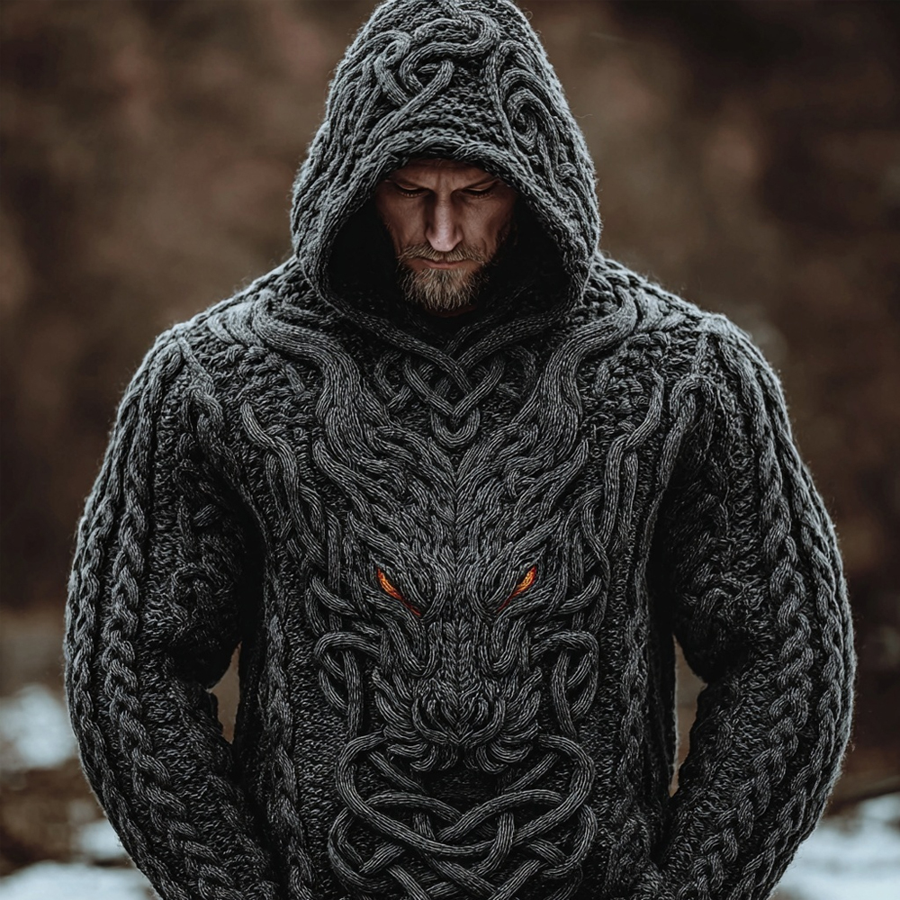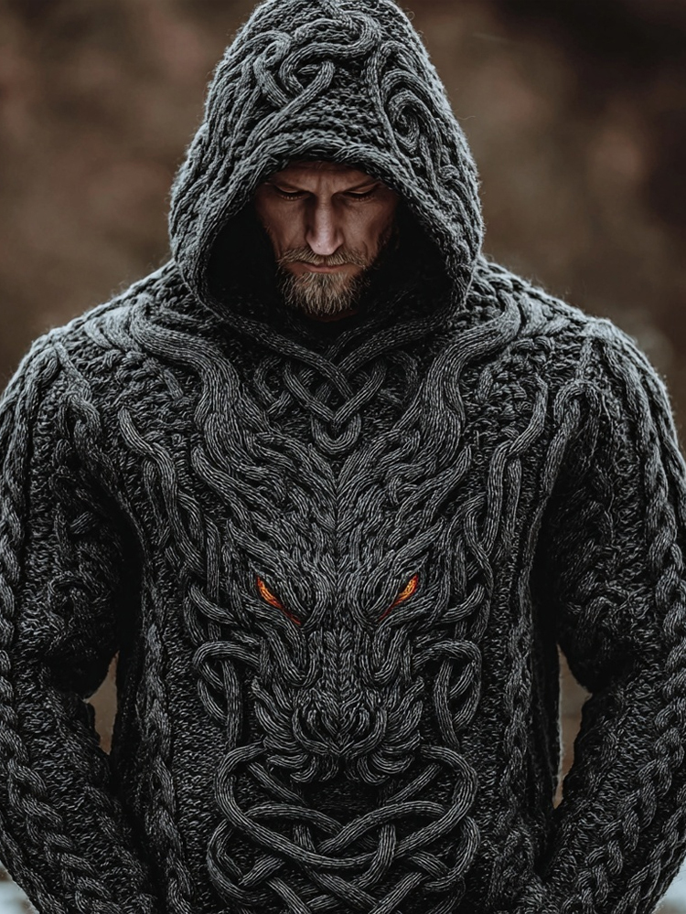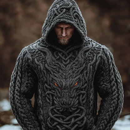 Men's Viking Celtic Dragon Pattern Cozy Knit Hooded Sweater