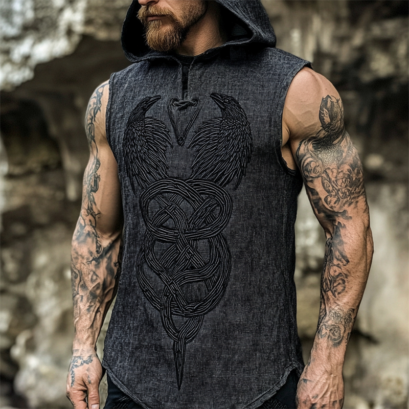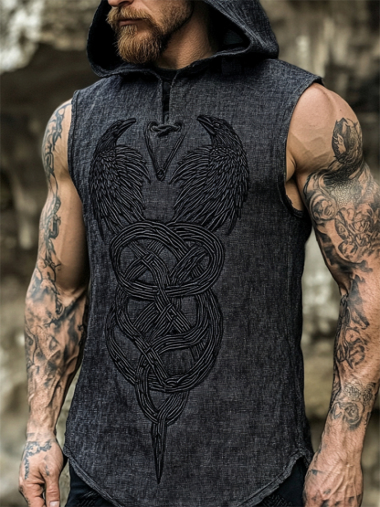Men's Viking Ravens Celtic Knot Embroidered Hooded Linen Vest