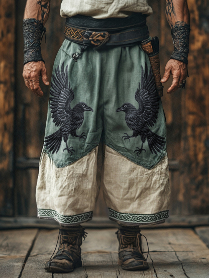 Mens Vintage Viking Dark Raven Relief Celtic Knot Patchwork Art Linen Lounge Pants