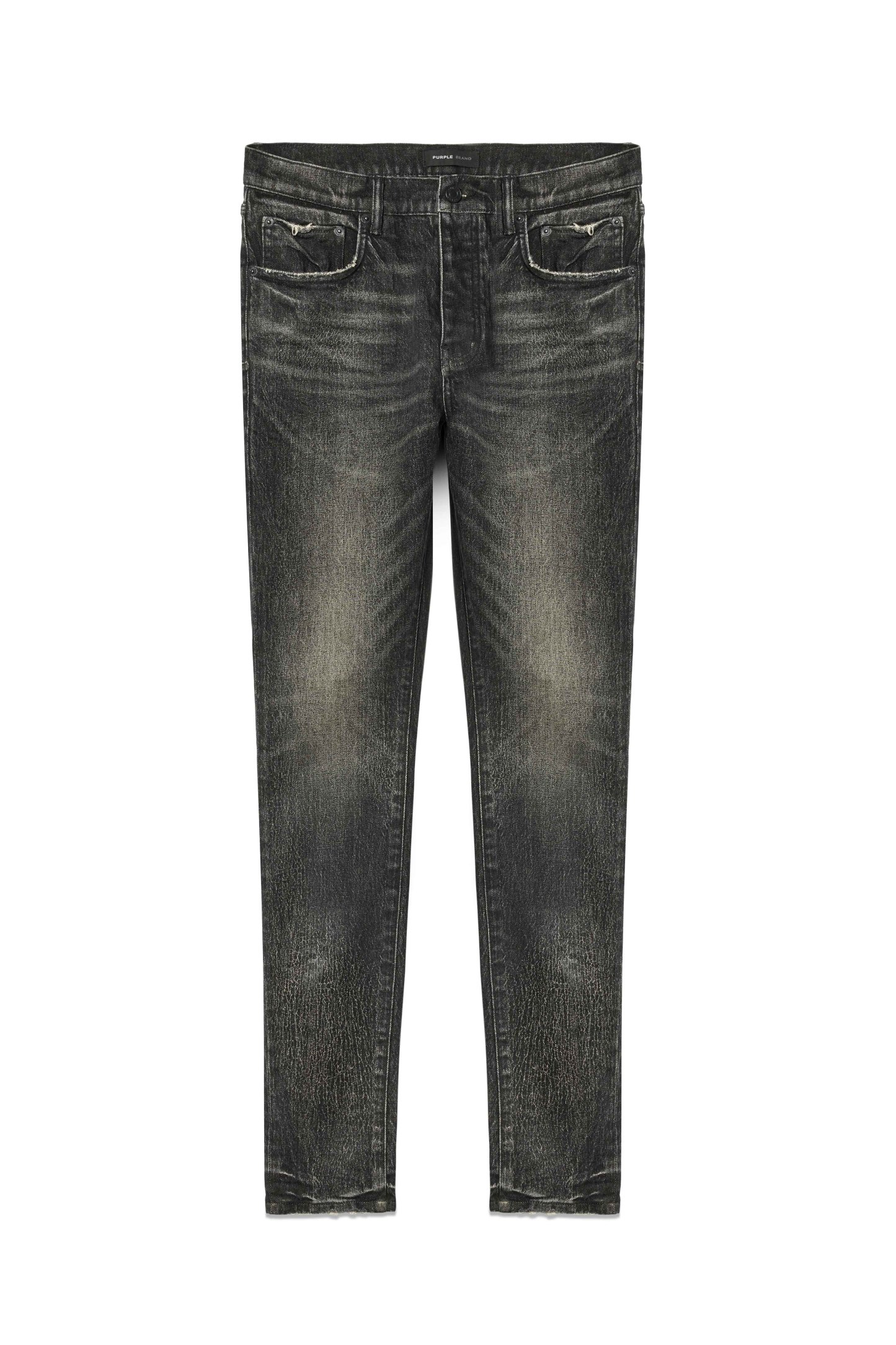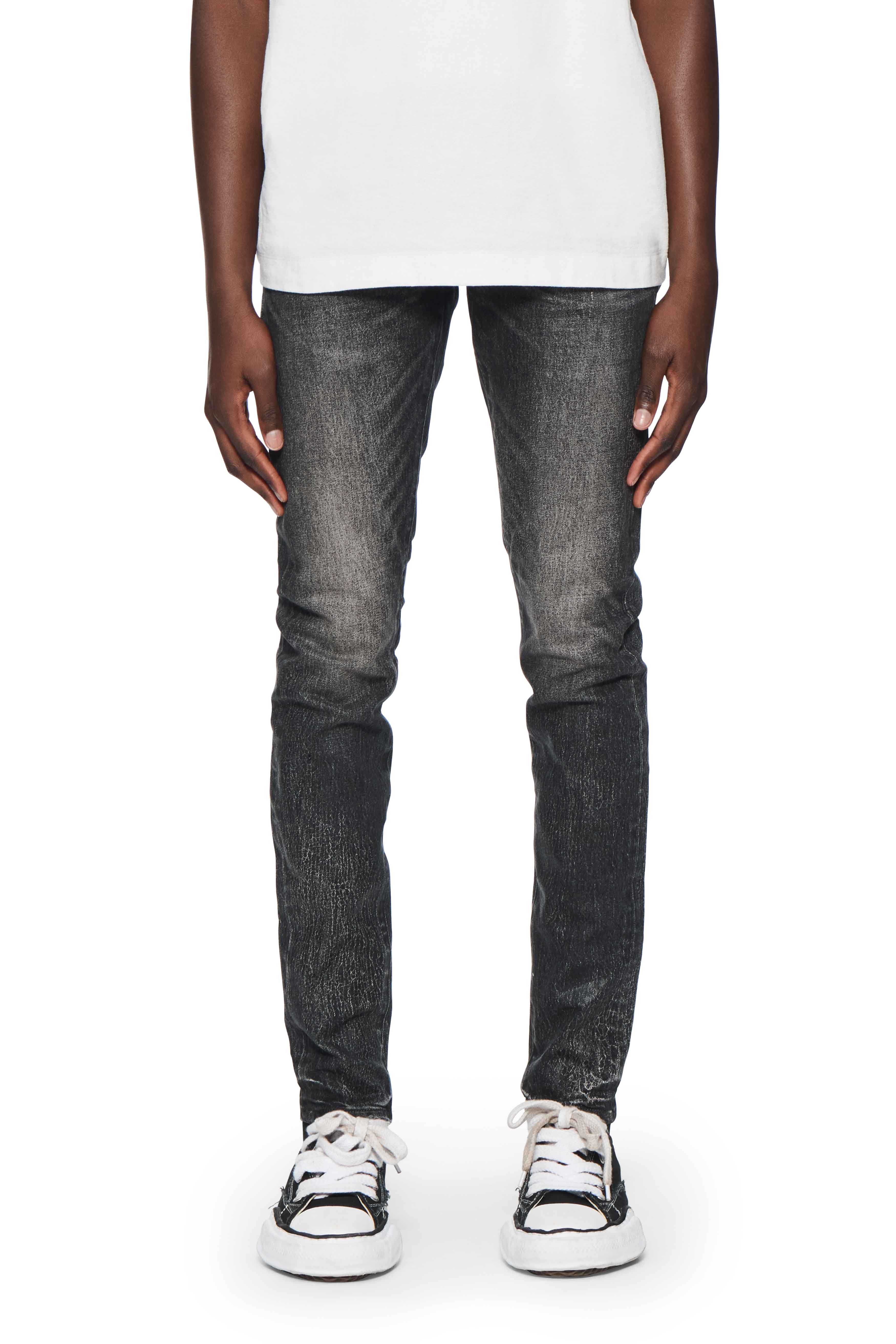 Crafted from premium black stretch denim, this crackled and coated low rise skinny is faded by hand for a vintage look.