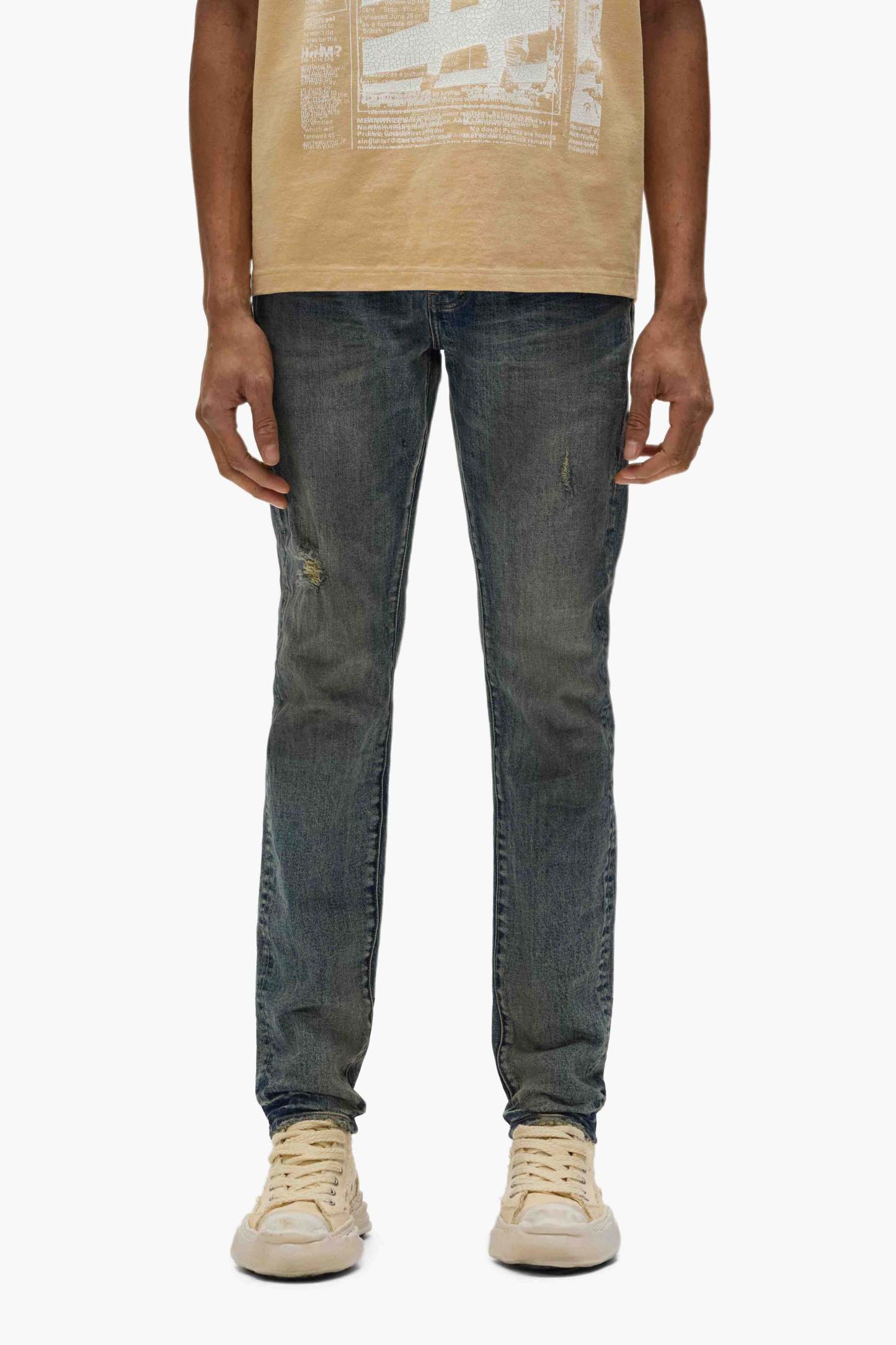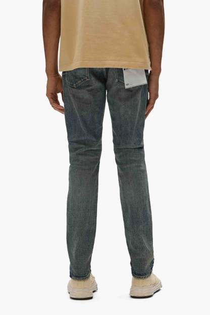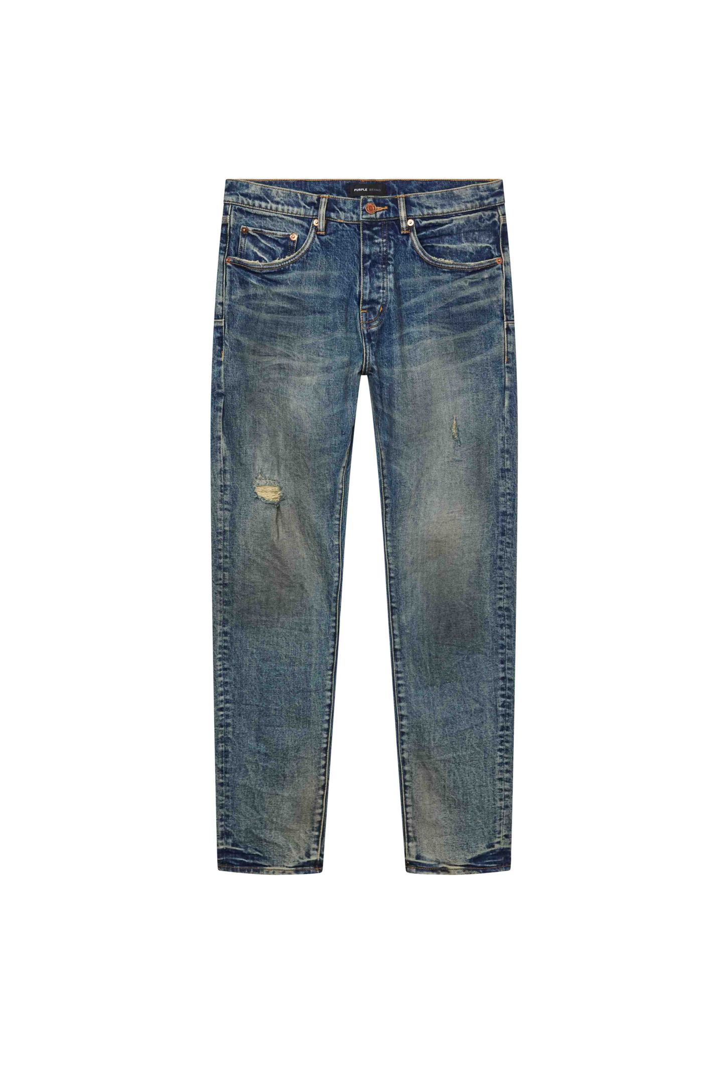 Our P001 is a low-rise skinny men’s jean, crafted from premium stretch denim with classic five-pocket construction that includes a button-fly closure and reinforced belt loops as well as hidden rivets and an inner lining on the back pockets for durability. It’s fitted through the thigh to the ankle for a classic taper, and comes in a medium indigo wash with hand-distressing and a corrosion effect. A custom Purple cowhide leather patch, a back pocket flasher and a logo hangtag lend signature branded finishes.