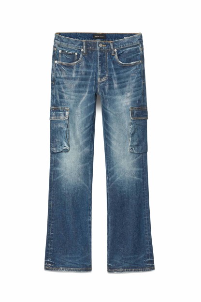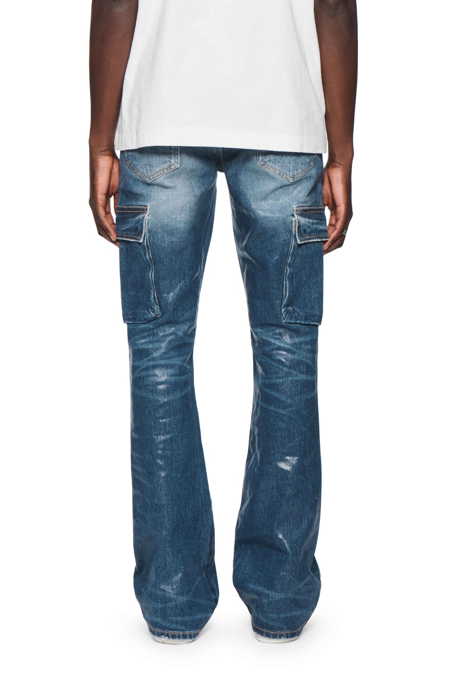 Crafted from premium stretch denim, this faded low rise boot-cut comes in a medium indigo wash with a coated finish and double cargo pockets.