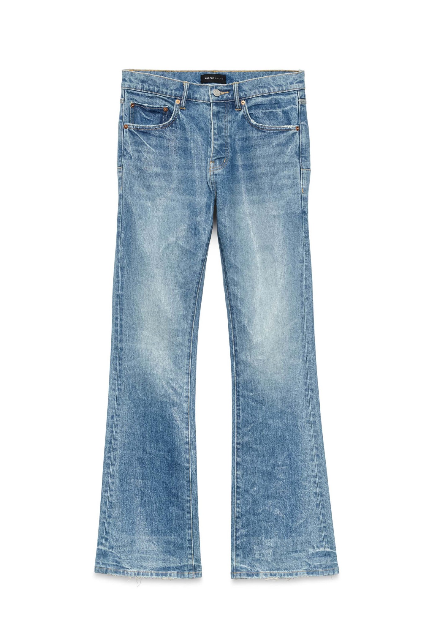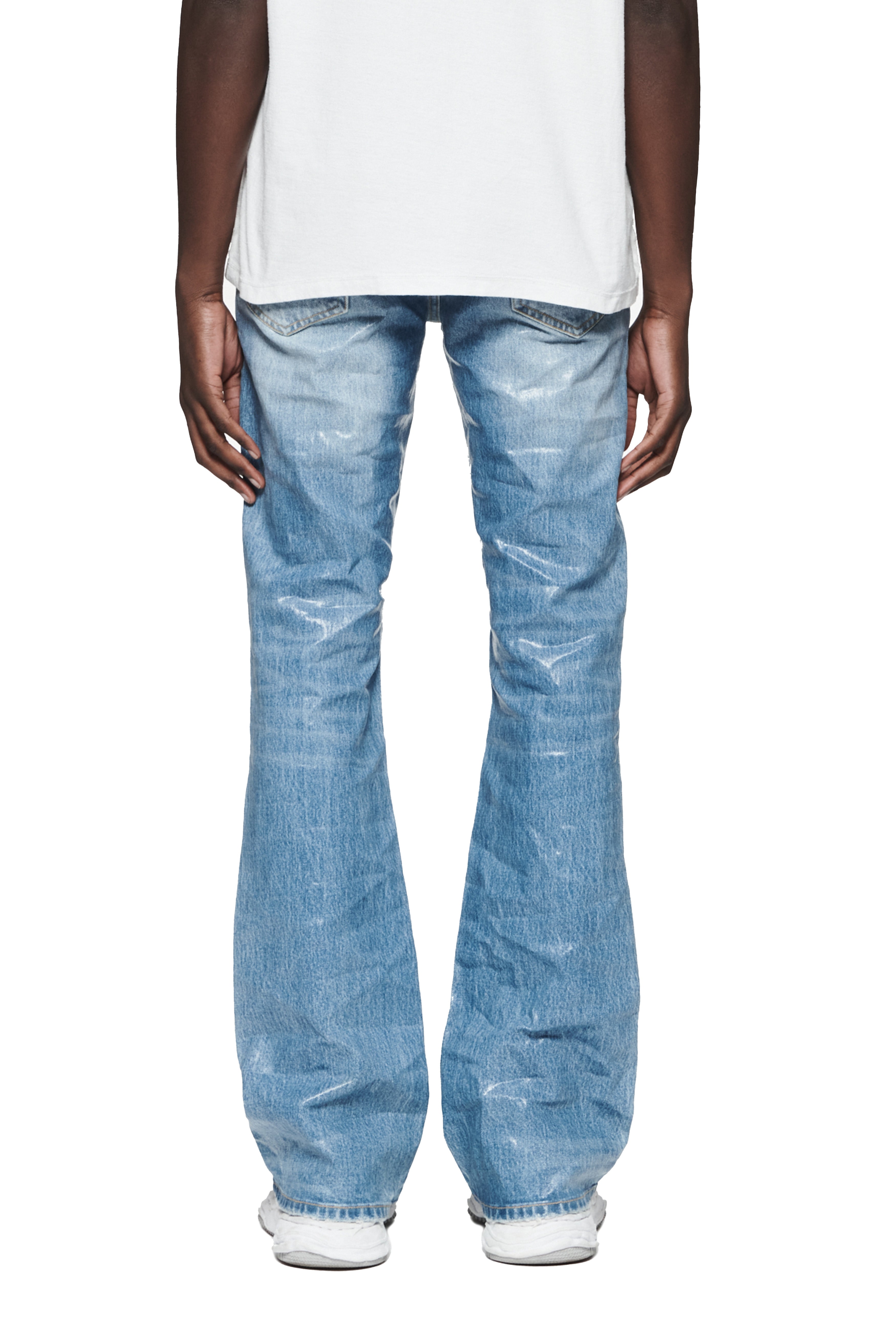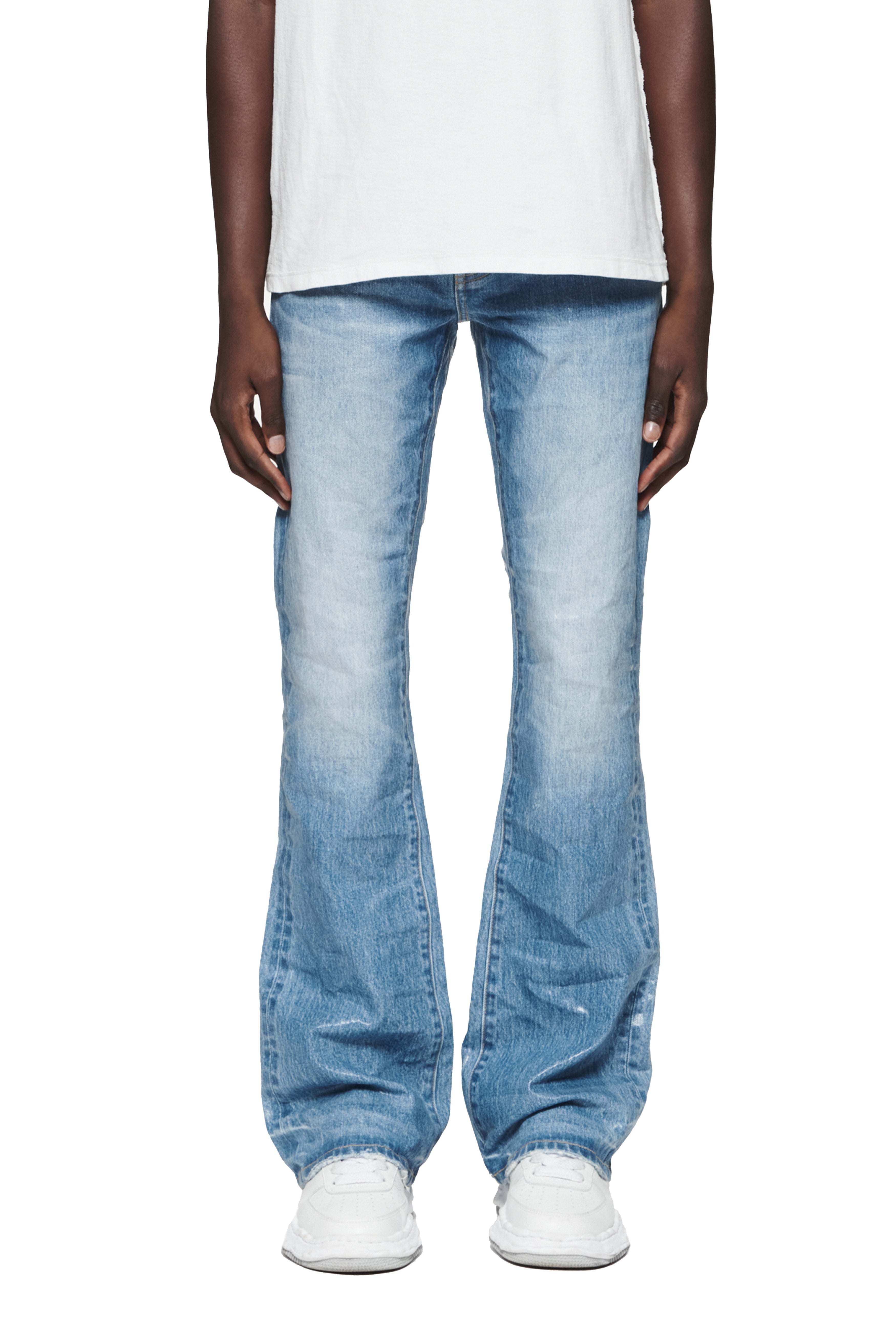Crafted from premium light indigo stretch denim with a coated finish, this faded low rise flare is detailed with reinforced belt loops and hidden back-pocket rivets for extra durability and chambray lining for a more comfortable fit.