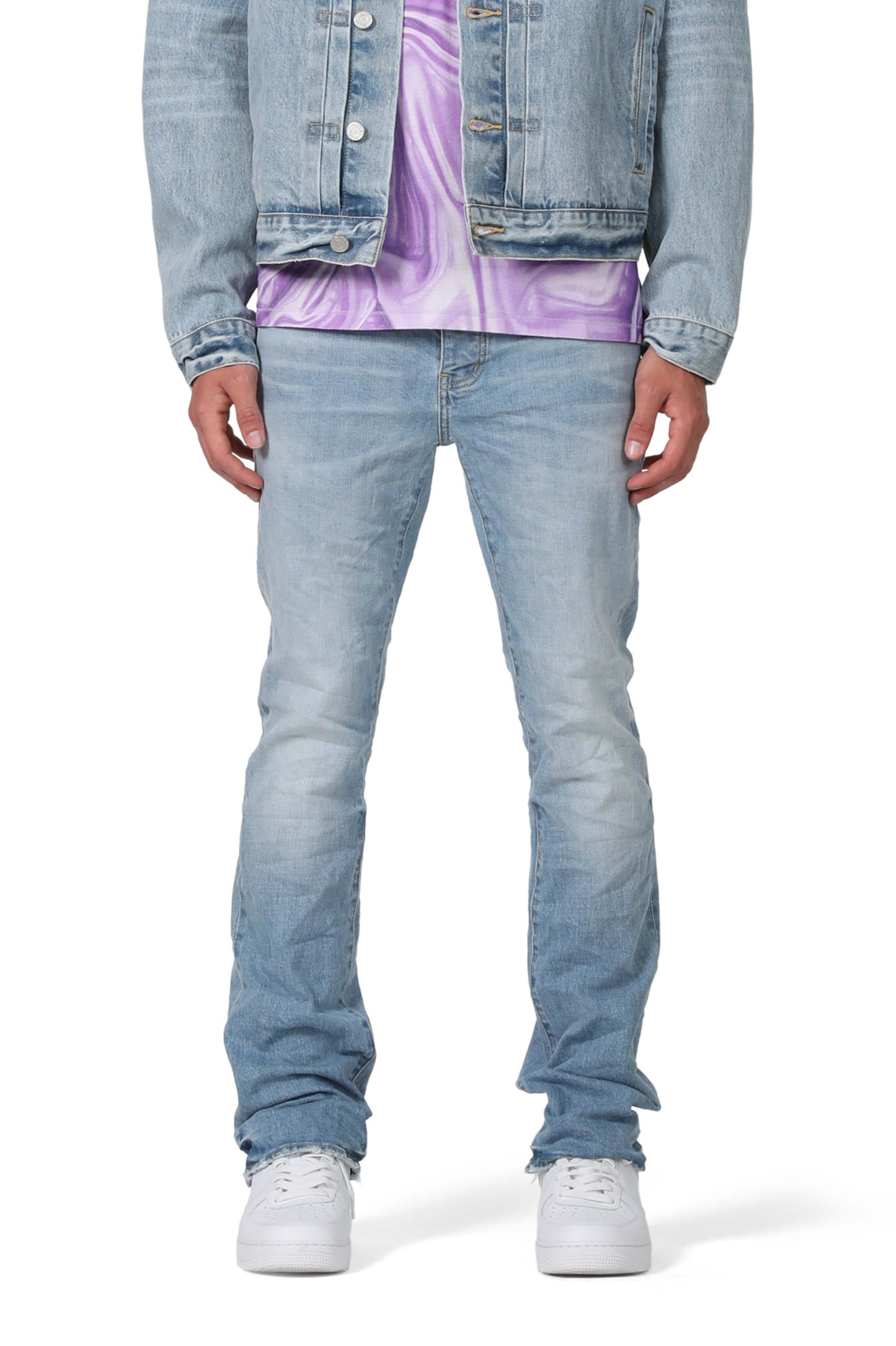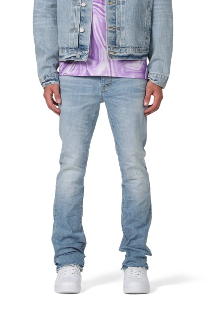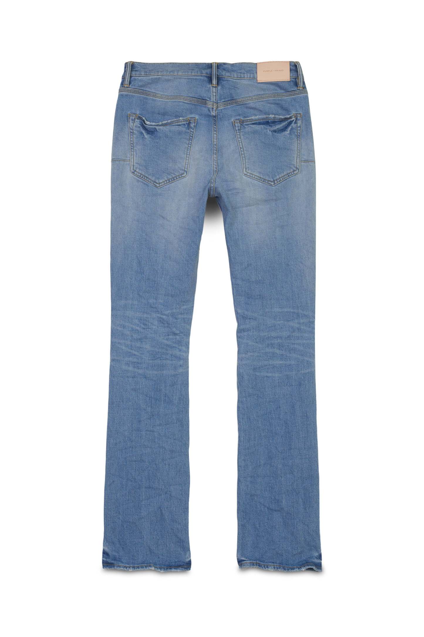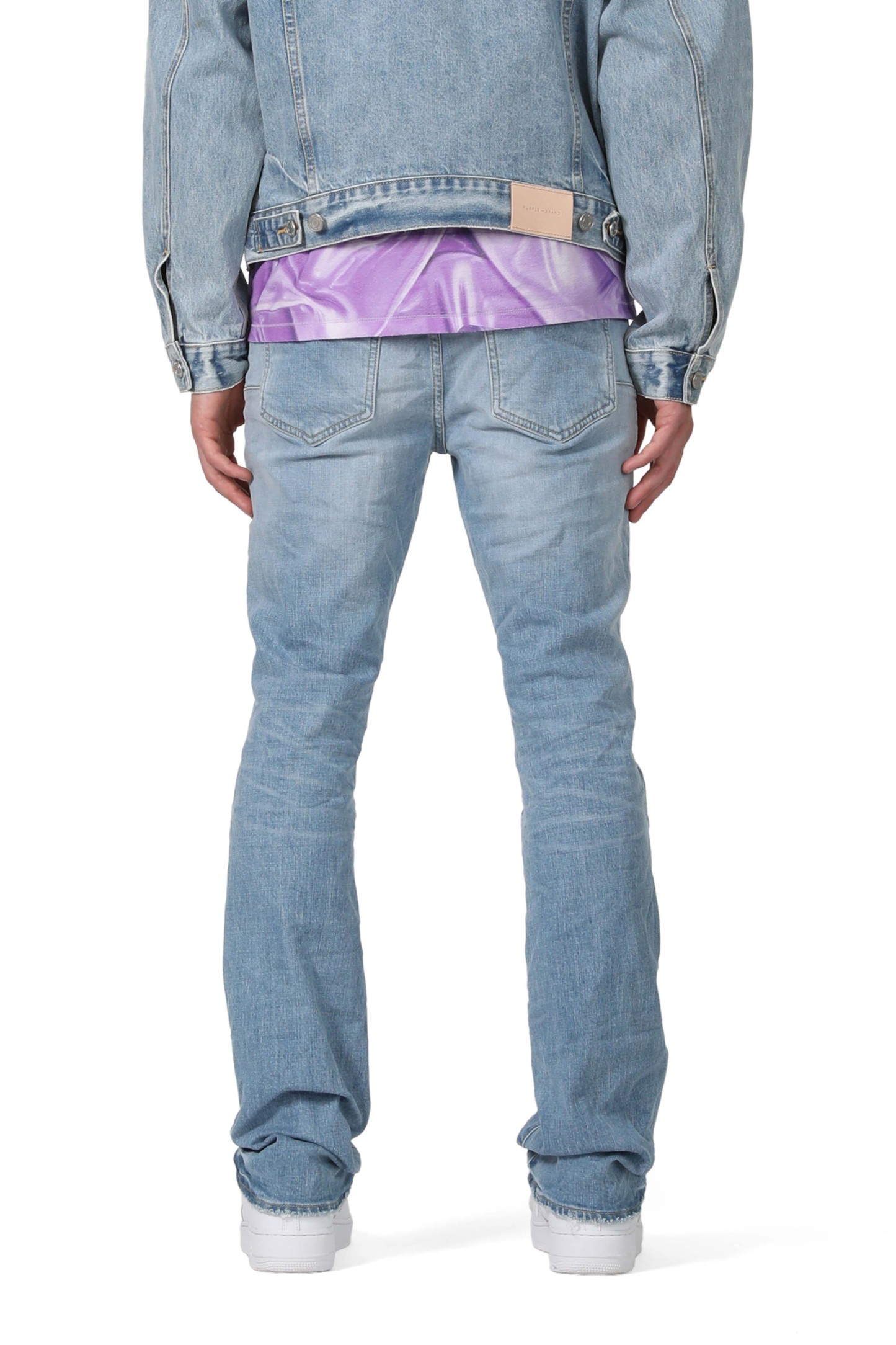 Our P004 is a low-rise flared men’s jean, crafted from premium stretch denim with classic five-pocket construction that includes a button-fly closure and reinforced belt loops as well as hidden rivets and an inner lining on the back pockets for durability. It’s fitted through the thigh and widens to a flared hem, in a light indigo wash with hand-fading and distressing. A custom Purple cowhide leather patch, a back pocket flasher and a logo hangtag lend signature branded finishes.