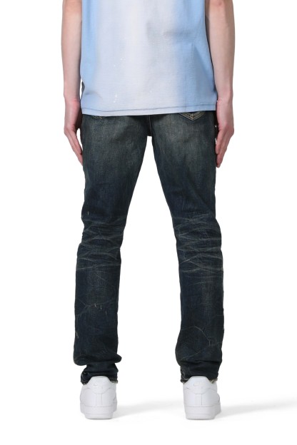 Constructed from dark indigo premium stretch denim, this mid rise slim straight leg is detailed with a vintage wash and small abrasions throughout.
