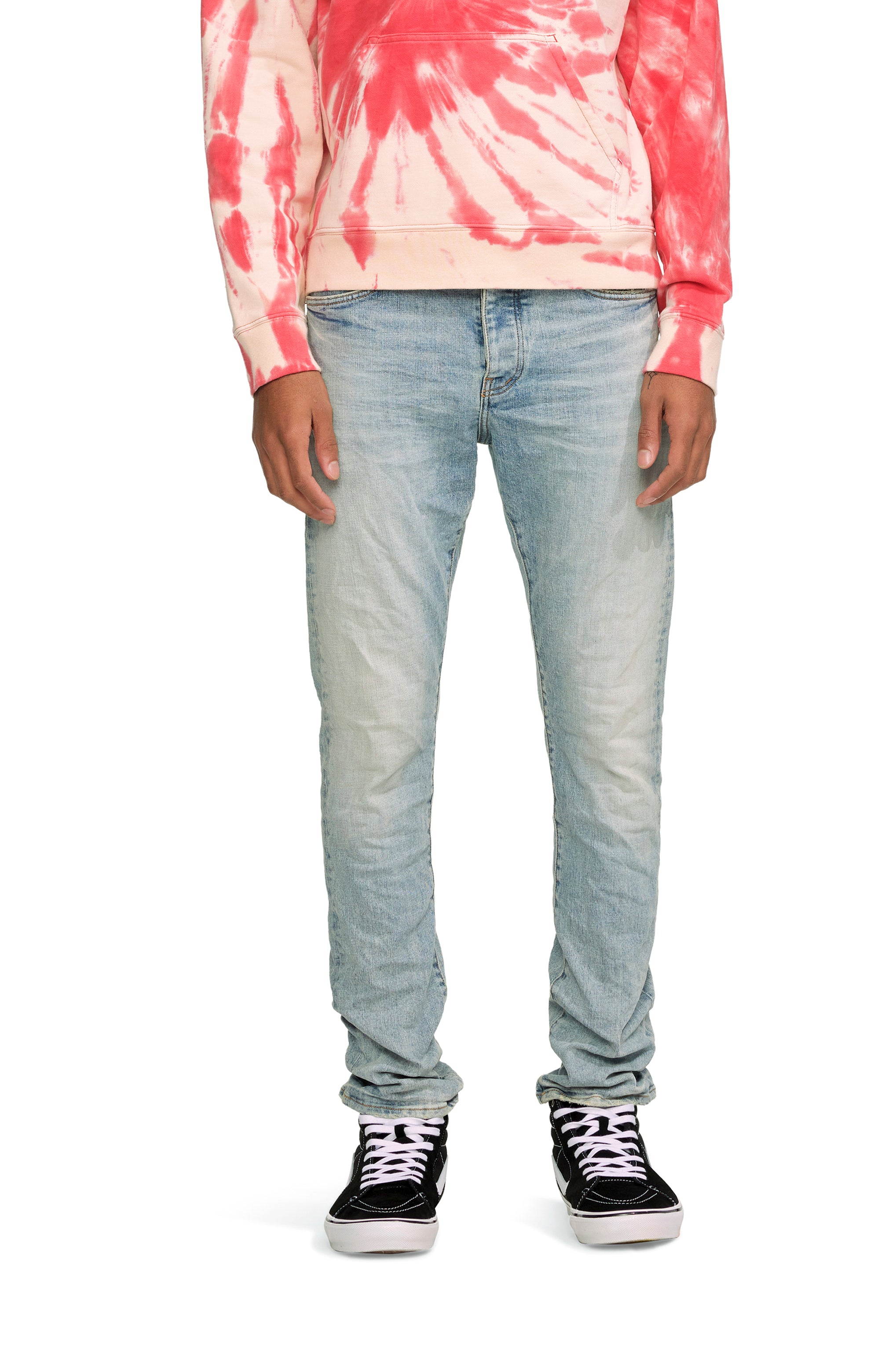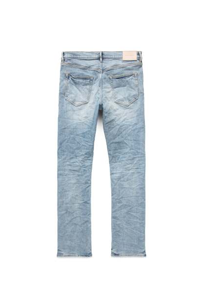 Crafted from premium stretch denim in a light indigo wash, this mid-rise straight leg is whiskered and crinkled by hand, with faded thighs for a vintage feel. The style is detailed with reinforced belt loops and hidden back-pocket rivets for extra durability, chambray lining for a more comfortable fit, bar-tack stitching, a custom Purple cowhide leather patch and signature hang tag branding.