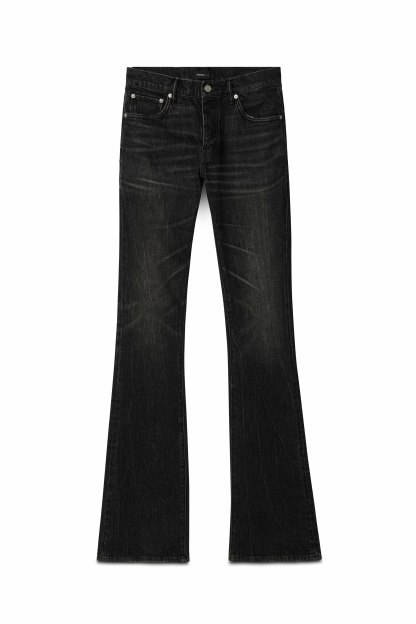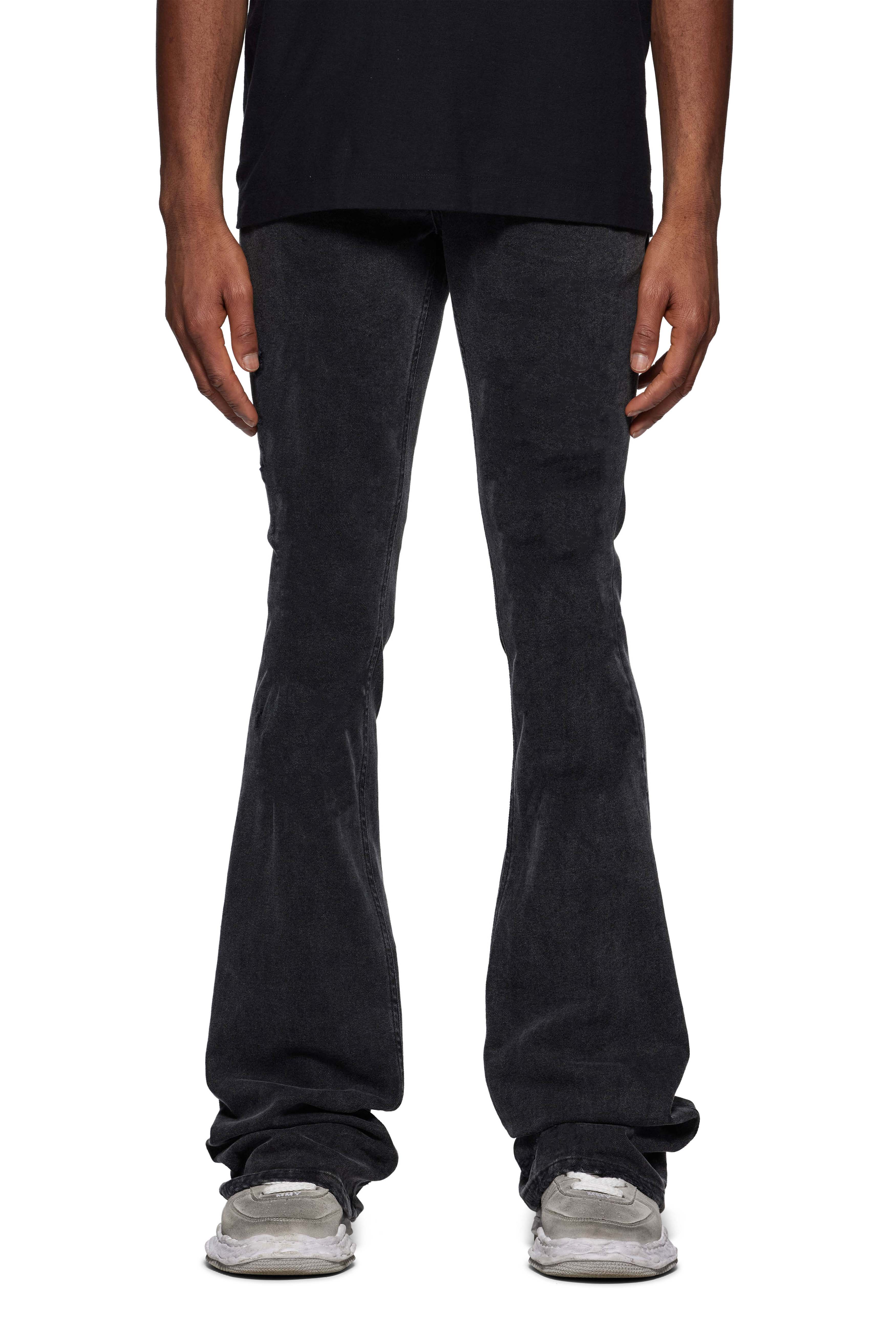 This low rise boot-cut pant is crafted from black flocked velvet.