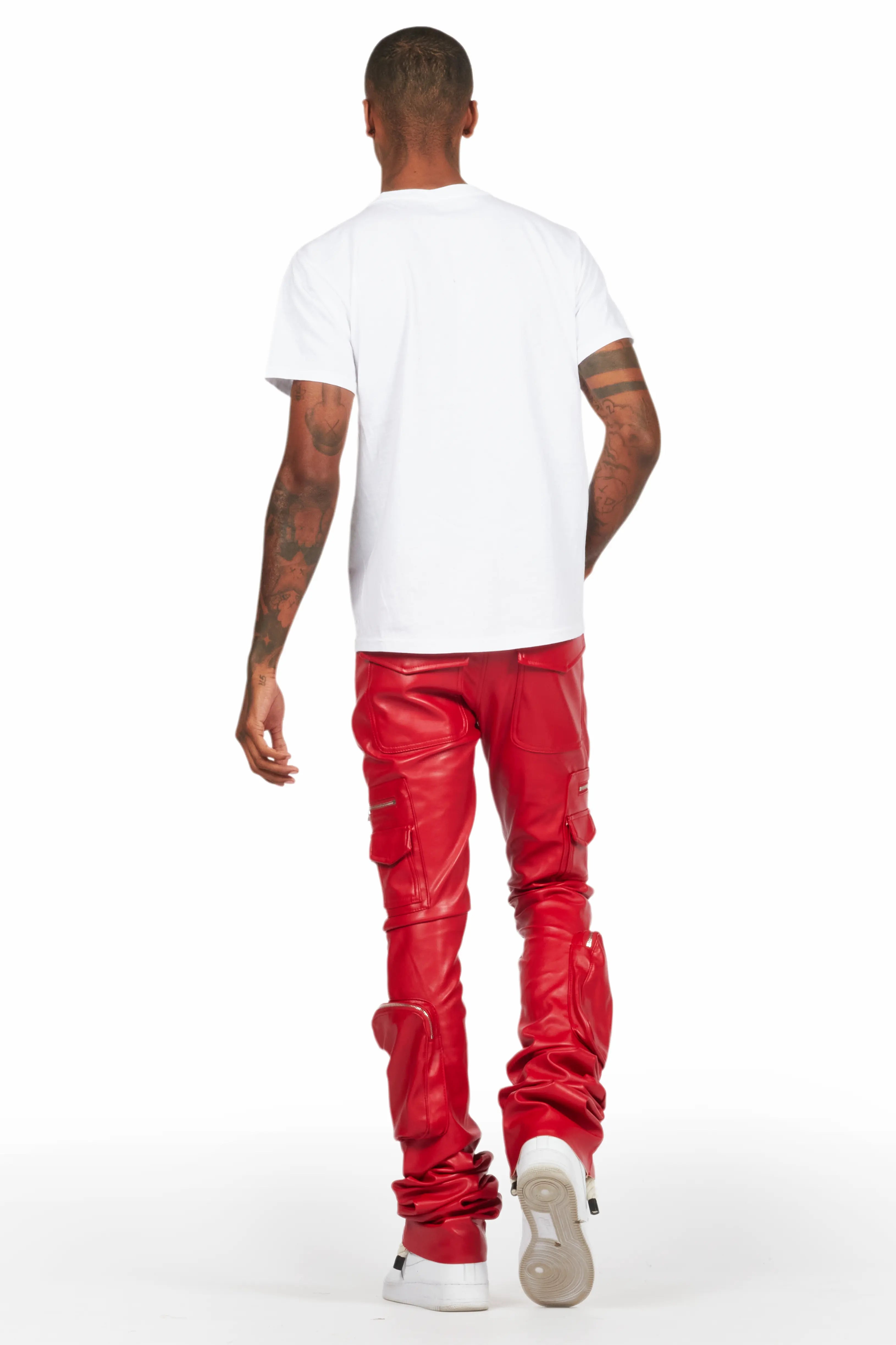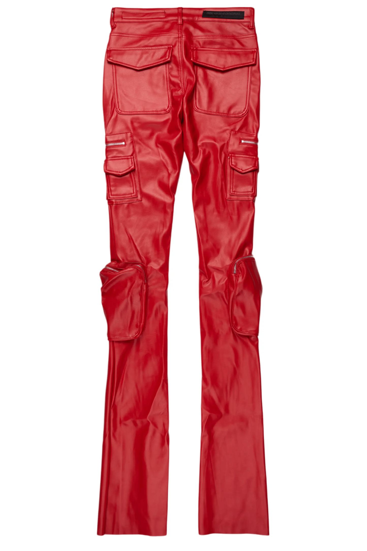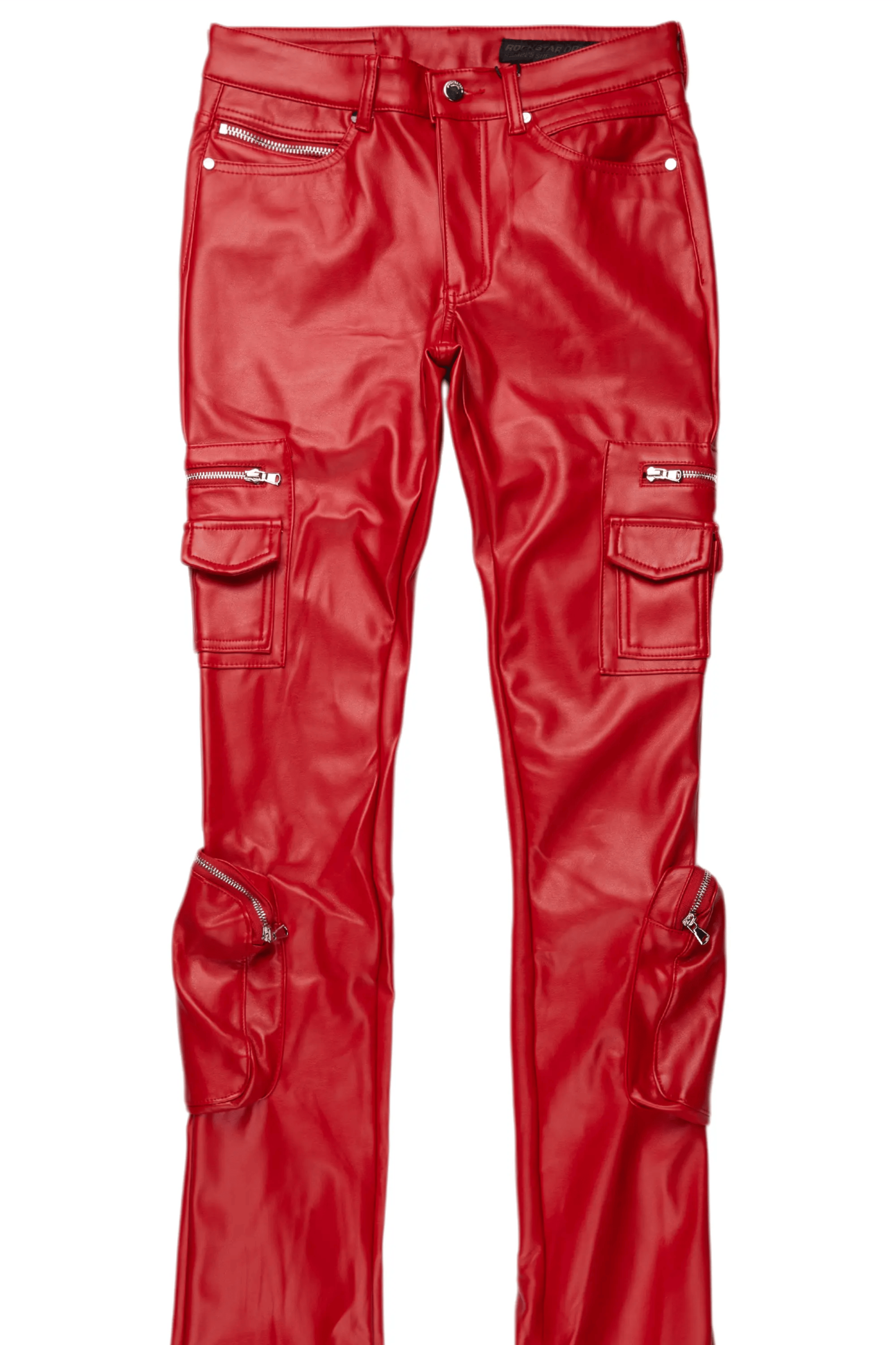 An urban super stacked cargo jean for men in red. Designed with faux leather fabric and extra long legs for the perfect streetwear style.