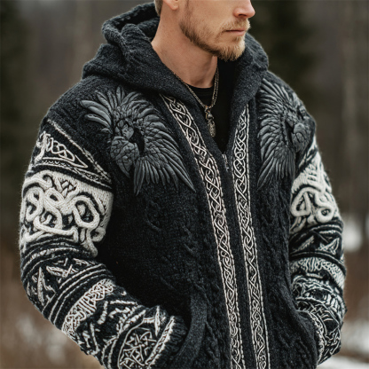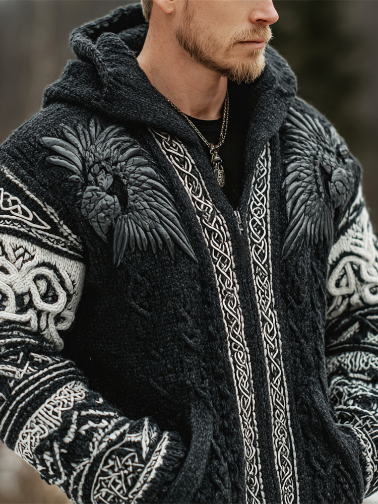 Viking Black Raven Knit Design Men's Hooded Zip-up Sweater